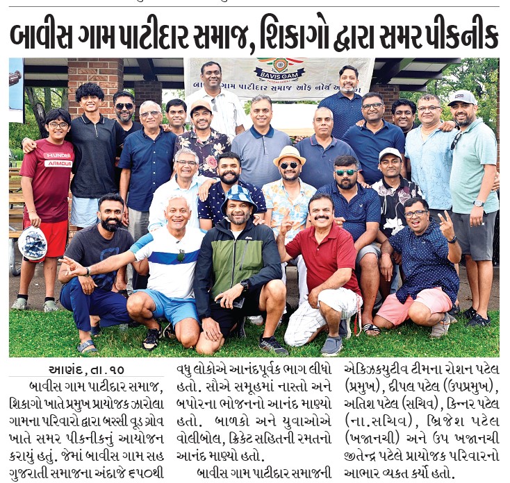 These days, social networking is essential for our traditions, to not only survive but to thrive, and in keeping our Patel heritage going strong in this vast and diverse nation. We, the elders of our society, have an obligation to pass on the culture and traditions to our future generations. Heads of household, our youth, and elders (grandparents) each play very important, thoughtful, and active roles in preserving our way of life. Therefore, all are urged to attend and actively participate in our programs. An important aspect of our Samaj includes the marriages of our youth amongst our Patel families, within same Gor is preferred. In good faith, Samaj will organize at least 3 events per year (Picnic, Garba, and Diwali dinners). We encourage the newer generations to come up with fresh ideas and organize more events, present to the Executive Body, get approval for fundraising, and access the volunteer resources of the Bavis Gam.